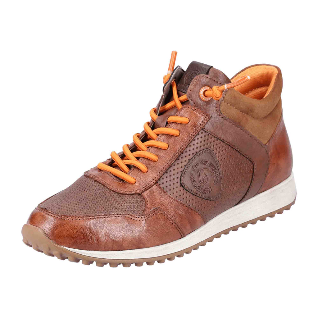 Upgrade your style with these chic Remonte high-top sneakers in sleek brown featuring a striking white sole. The shoes come with a practical zipper, an orange elastic band, and a black lace for versatile styling options. Crafted from smooth leather, these sneakers offer a cozy micro-velour lining for breathability and warmth. The lightweight sole provides excellent cushioning for all-day comfort.