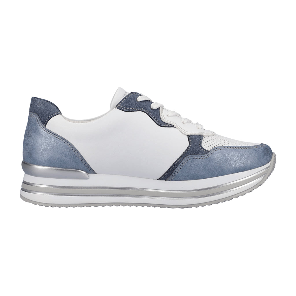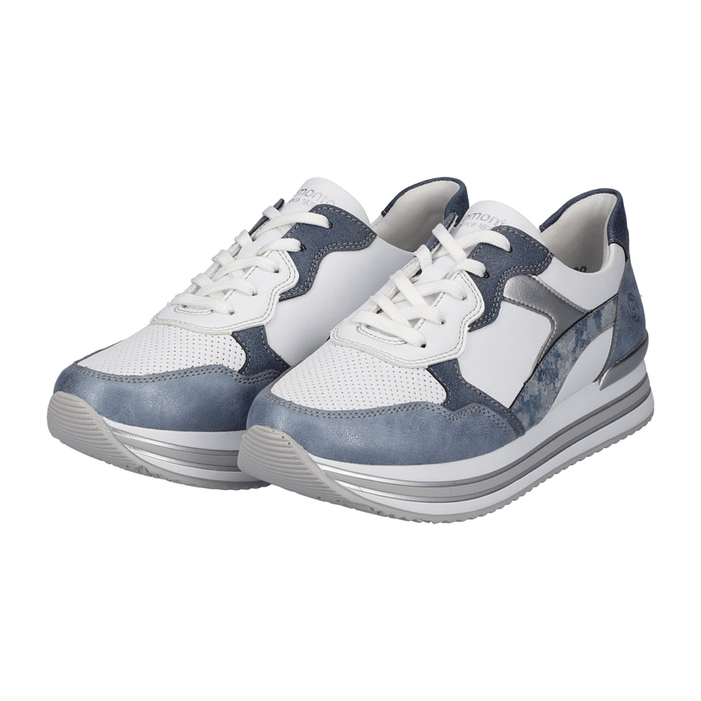 Get ready to step out in style with these white and blue Remonte sneakers made from high-quality synthetic leather. Not only do they exude style, but they also provide exceptional grip and a perfect fit thanks to the lacing system. The practical features are complemented by the extra soft removable insole and the remarkably light and flexible platform sole! Enjoy ideal comfort with the breathable microvelour lining. These shoes are designed in a comfort width and are available in larger sizes. A fantastic and comfortable companion for your everyday adventures!