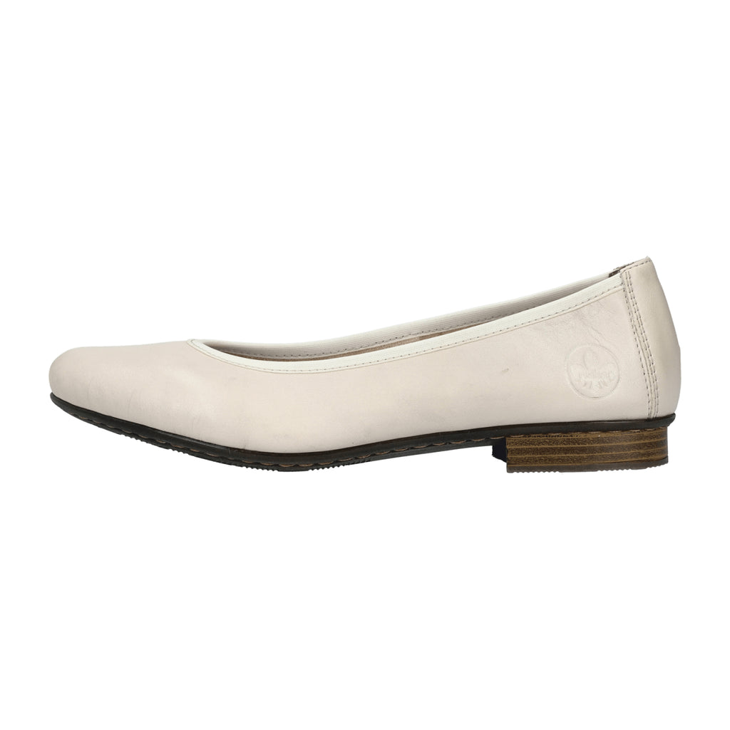 Slip into comfort with Rieker! These cream-white ballerina pumps made of smooth leather by Rieker provide ample space for your foot while keeping it secure. The model features no closure, allowing for quick slip-on. The shock-absorbing and lightweight sole ensures stability, while the extra soft insole guarantees a comfortable fit. Experience fashionable wellness with Rieker's style!